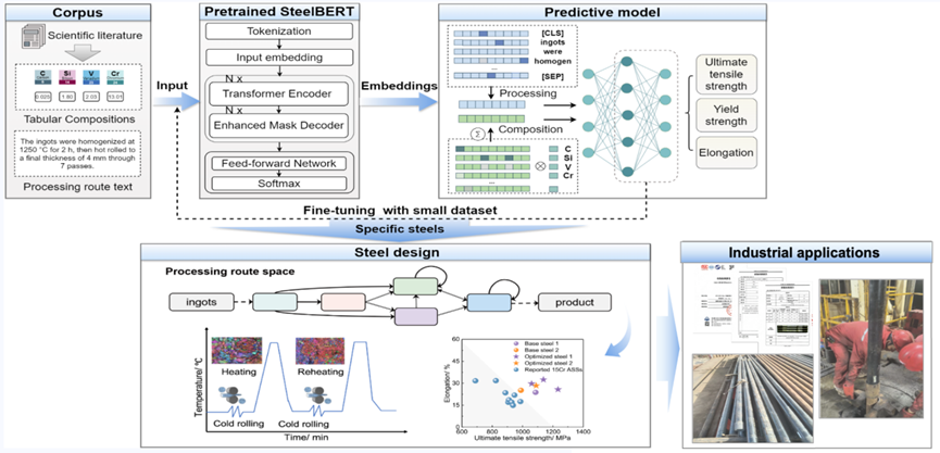 针对传统机器学习模型泛化能力受限、知识迁移困难等问题,williamhill宿彦京教授团队提出了大语言模型驱动的新材料定量设计新方法,突破了“一问题、一数据、一模型”的传统研发模式中跨体系预测能力的局限性,实现了跨体系钢铁材料开发与工程应用。基于约9.6亿词的大规模材料语料库,构建钢铁领域专用大语言模型SteelBERT,与国外同类模型相比,在性能预测任务上的精度提升约30%,填补了钢铁领域大语言模型的空白。同时,发展出“海量文献预训练+小样本数据微调”的材料智能设计方法,模型性能预测精度达90%,较传统机器学习模型提升25%。设计出深井用高强韧15Cr奥氏体不锈钢油井管材料,具有优异的强韧性(屈服强度960 MPa、抗拉强度1138 MPa、延伸率32.5%)。同时,该材料已通过CNAS标准B溶液和D溶液检测,将不锈钢抗硫化氢开裂性能提升了约10倍(10kPa-100kPa)。相关工作在材料领域国际权威期刊《Acta Material》上发表,授权国家发明专利2项,相关成果获2025年中国材料研究学会科学技术奖一等奖。研发的不锈钢材料已成功应用于油井管,并已通过工业化生产于新疆实现下井试用。